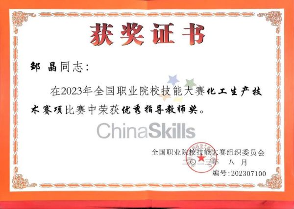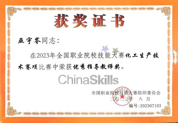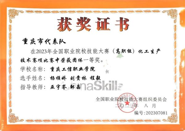 重庆工信职业学院22级药品生物技术专业学生杨顺娇、刘贵林、程毅斩获2023年全国职业院校技能大赛(高职组)化工生产技术赛项团体一等奖,为学校夺得全国职业院校技能大赛首金!巫宇岑、邹晶老师获评“优秀指导老师”。