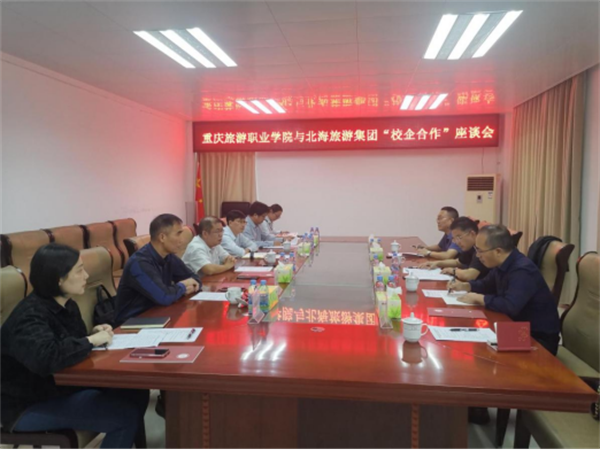 北海旅游集团党委书记、董事长蒋德明,集团总经理舒英杰,集团副总经理黎向新,集团人力资源总监刘科以及集团子公司相关负责人参加座谈会。座谈会上,蒋德明书记对熊斌书记一行的到来表示热烈欢迎,并介绍了北海旅游集团的基本情况,舒英杰总经理表达了北海旅游集团对旅游人才的需求以及详细介绍了合作思路与方向。熊斌书记介绍了重庆旅游职业学院的总体概况和未来发展前景,希望双方加强合作,完善协同育人机制,进一步深化产教融合,提高人才培养质量,在学生实习实训、就业、人才培养等方面加强交流对接,实现共赢。