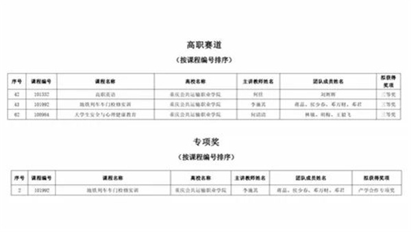 重庆公共运输职业学院获奖的课程分别为:由公共管理学院何佳教师团队主讲的课程《高职英语》、轨道交通学院李施其教师团队主讲的课程《地铁列车车门检修实训》、公共管理学院何清清教师团队主讲的课程《安全与心理健康教育》。《地铁列车车门检修实训》课程同时获得产学合作专项奖。