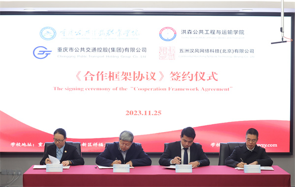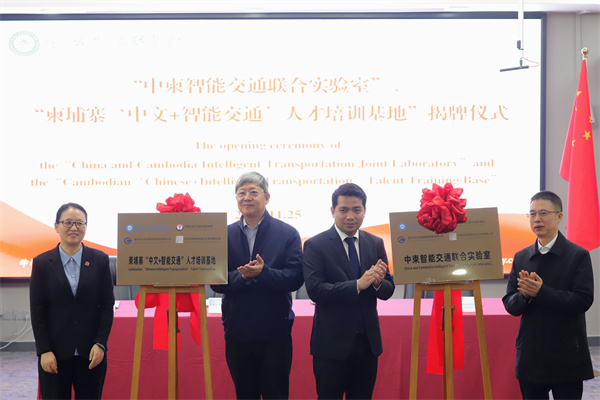 重庆公交集团监事会主席郑跃东,学校副校长刘畅,中文联盟主席、世界汉语教学学会智慧教育分会理事长、五洲汉风网络科技(北京)有限公司副总经理王锦红,洪森公共工程与运输学院副校长苏万塔共同签署《合作框架协议》,并为“中柬智能交通联合实验室”、“柬埔寨‘中文+智能交通’人才培训基地”揭牌。