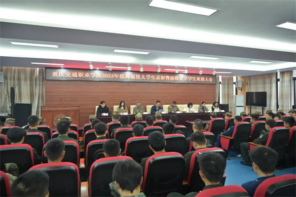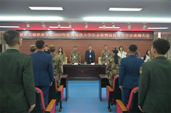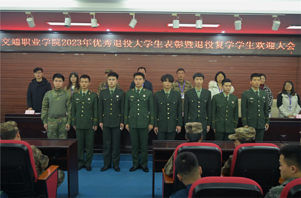 11月30日下午,重庆交通职业学院在铁道楼一楼报告厅举行2023年优秀退役大学生表彰暨退役复学学生欢迎大会。学校学生工作部部长杨宏、各二级学院党总支(直属党支部)书记、军事教研室全体教官,优秀退役大学生代表、2023年全体退役复学学生、砺剑社学生骨干以及2024年预征入伍学生代表共计100余人参加大会。