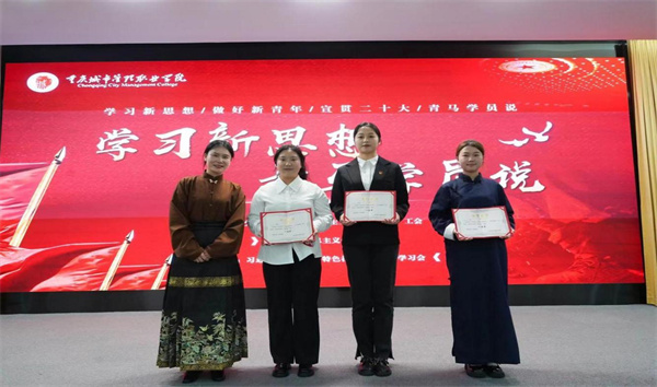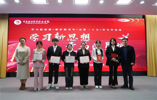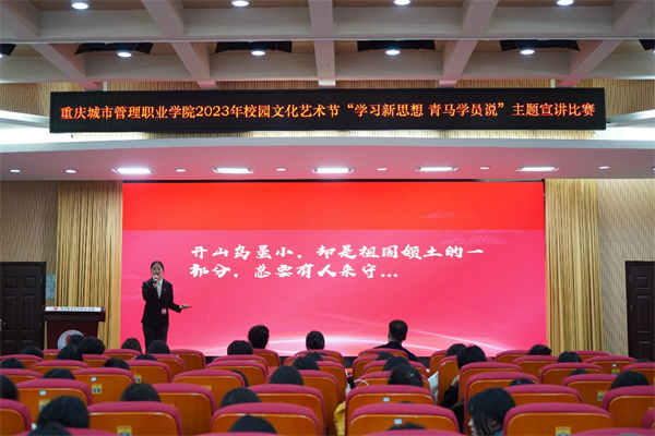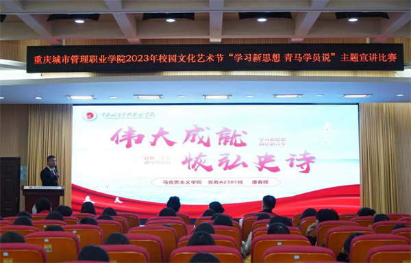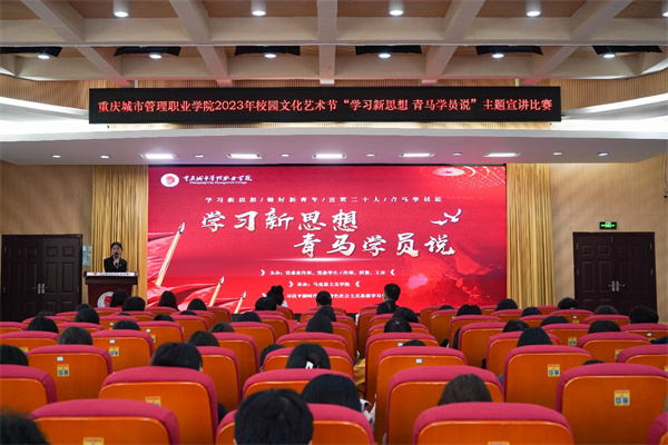 为学习贯彻习近平新时代中国特色社会主义思想,深学笃行习近平总书记关于青年工作的重要讲话精神,11月28日,由党委宣传部、党委学生工作部、团委、工会主办,马克思主义学院承办的2023年校园文化艺术节“学习新思想 青马学员说”主题宣讲比赛在重庆城市管理职业学院办公楼103会议室举行。由学校团委书记王婧、马克思主义学院副院长张媛艺、党务工作专业带头人张传忠三位思想政治教育领域的专家担任评委,共计16支队伍参与比赛,各二级学院学生代表150余人观看了比赛。