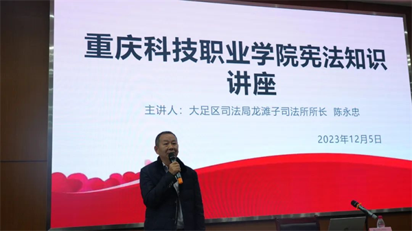 组织专题讲座。“12.4”国家宪法日,学校邀请大足区龙滩子司法所所长陈用中为全校师生举办专题讲座。讲座内容主要包括宪法的基本原理、我国宪法的发展历程、宪法修正案的主要内容等。通过专题讲座,使师生们对宪法有更深入的了解。