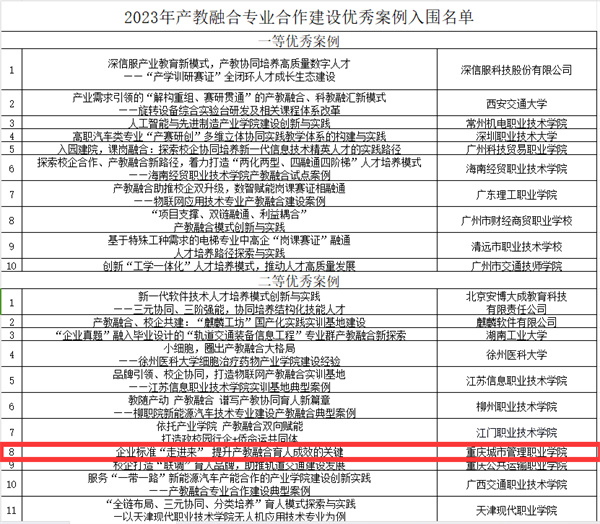 12月23日,工业和信息化部人才交流中心公布了2023年工业和信息化部产教融合专业合作建设优秀案例名单,重庆城市管理职业学院工业机器人技术专业产教融合建设案例入围并获二等奖。