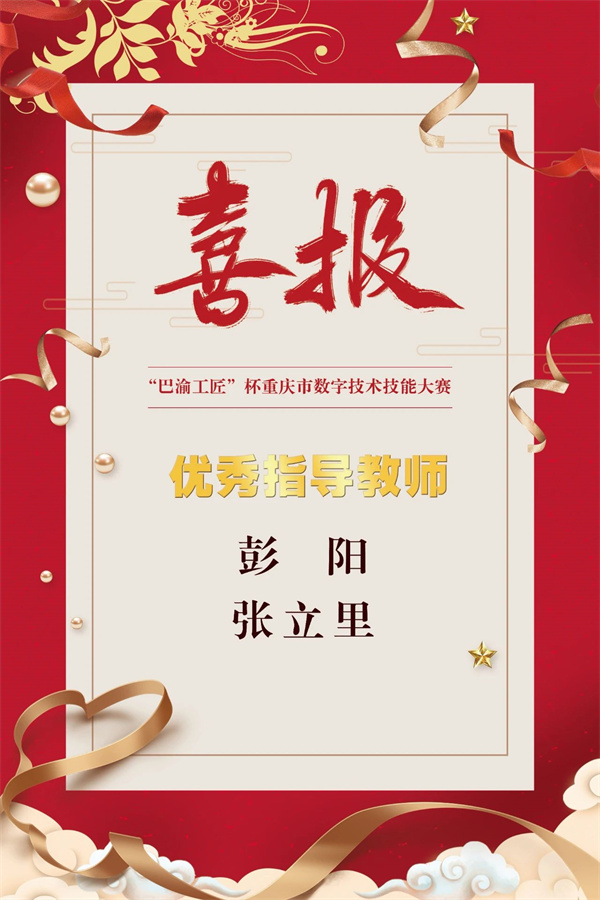 大数据22级2班张阳丰、赵浩任、数字媒体22级1班刘智强在2023年“巴渝工匠”杯重庆市数字技术技能大赛中荣获“区块链技术应用与创新”获得学生组三等奖,彭阳、张立里老师为优秀指导教师。