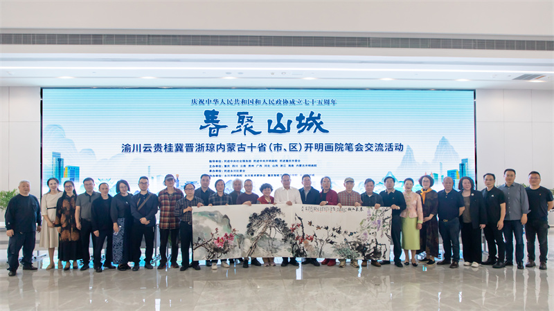 为庆祝中华人民共和国和人民政协成立七十五周年,4月1日,“春聚山城”渝川云贵桂冀晋浙琼内蒙古十省(市、区)开明画院书画笔会交流活动在重庆智能工程职业学院举行。