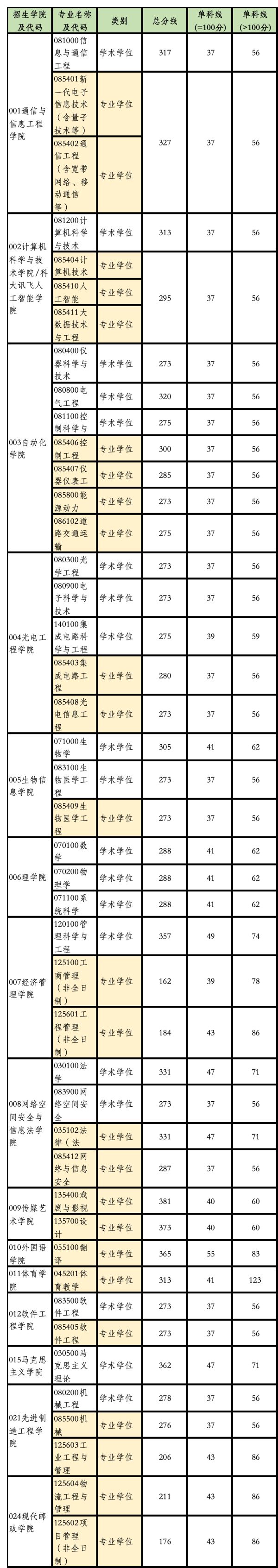 重庆邮电大学2024年硕士研究生招生考试考生进入复试的初试成绩基本要求
