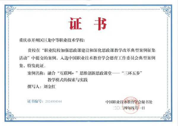 团队在课堂教学上推行“龙师龙课”发展模式,将“课堂”分为邹龙课堂、小龙课堂、巨龙课堂;将教师分为邹龙期教师、小龙状教师、巨龙态教师,让“龙师”通过三个层级递进式发展,实现“龙课”提升,取得显著成效。目前,团队已荣获重庆市教学成果奖培育立项1个,刘金红撰写的典型案件入选中国职业技术教育学会德育工作委员会典型案例。此外,团队成员刘金红、樊声元、张俊被认定为高级“双师型”教师,刘昌勇、王明秋被认定为中级“双师型”教师。这些成果充分展示了团队的教学实力和创新能力。