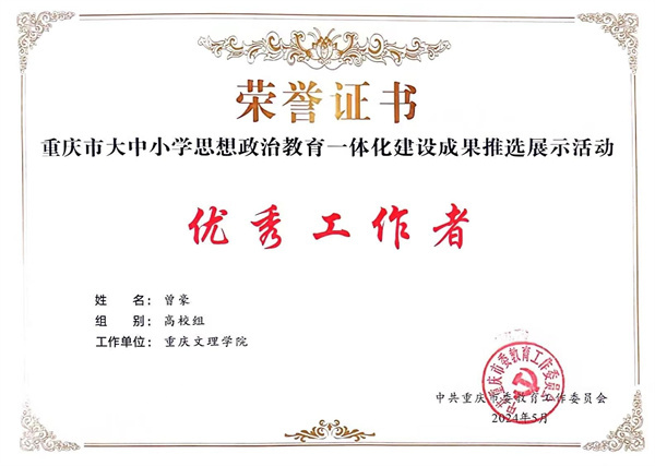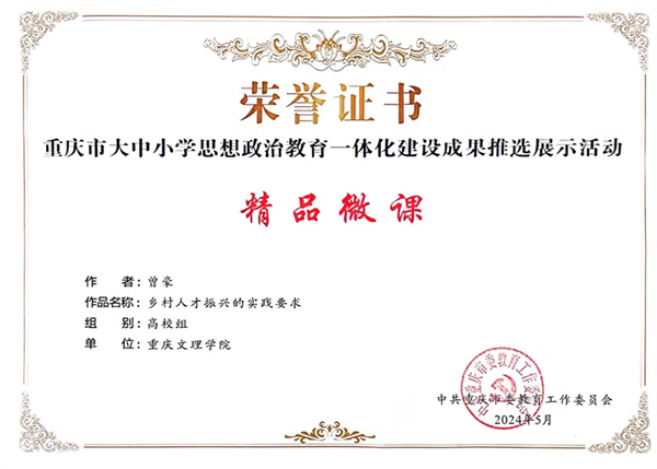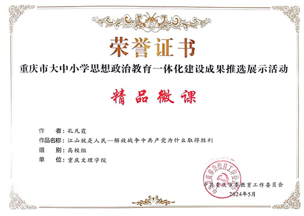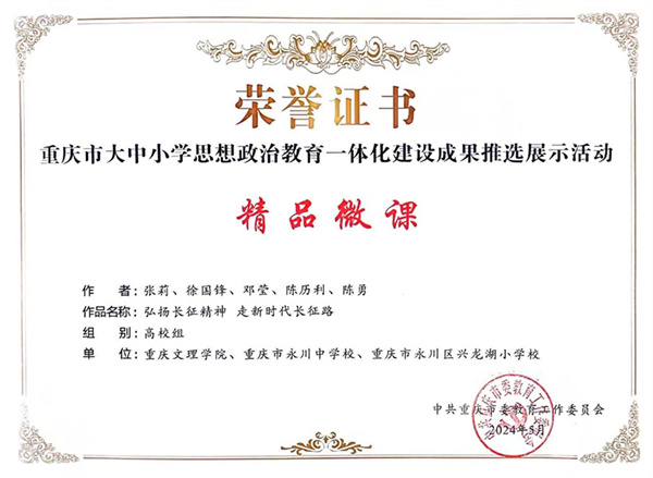 重庆文理学院马克思主义学院副教授曾豪主讲的《乡村人才振兴的实践要求》、教师孔凡霞主讲的《江山就是人民——解放战争中国共产党为什么取得胜利》、教授张莉团队主讲的《弘扬长征精神 走新时代长征路》入选重庆市大中小学思想政治教育一体化建设精品微课,教授胡守敏执笔的《夯实四个共建、用好四支力量、聚焦四大内容、抓好四个环节 ——西部职教基地(永川)大中小学思想政治教育一体化建设案例》获批重庆市大中小学思想政治教育一体化建设实践案例,副教授曾豪获评重庆市大中小学思想政治教育一体化建设优秀工作者。