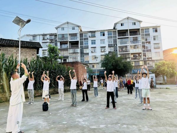 基层服务践行团队在汪家岩村居民楼附近空地成功举办“八段锦韵,幸福启航”传统养生操普及活动,旨在通过传承千年的八段锦养生操,为乡村居民的健康生活添上一抹亮丽的色彩。