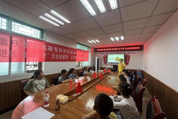 医学技术学院党总支副书记吴洁带领党员师生、“营”火虫食品安全科普队、红岩志愿者服务队共计20余名师生志愿者积极开展“知食进校,童心向党”暑期“三下乡”社会实践活动。一是“营”火虫食品安全科普队开展了知“食”小课堂、知“食”加油站、知“食”博物馆,立足于调研目前农村地区儿童膳食状况、食品安全意识等,用知“食”之力助力农村地区学龄儿童健康成长。二是组织红岩志愿者服务队为学龄儿童开展了一场生动的红岩事迹宣讲,让他们知红岩、懂红岩、爱红岩,更加深刻体会新中国的来之不易。三是慰问当地留守儿童、敬老院空巢老人,陪他们聊天的同时,也带去了关心和温暖,让他们不觉孤单。四是积极开展露天义诊,服务当地村民测量血压、血糖,及早筛查身体疾病,关注群众身体健康。五是联合石柱县沙子镇沙子村党支部开展了结对共建活动,就未来工作规划、活动内容进行了深入研讨。