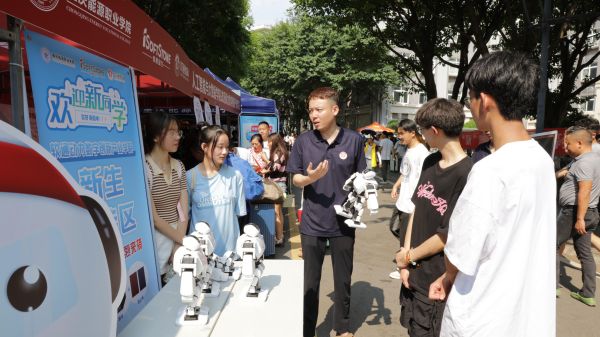 “哇,好多机器人一起跳操、还会做俯卧撑!”人工智能与大数据学院大本营前挤满了围观人群,老师向新生和家长作专业介绍、产品演示,同学们满怀期待。
