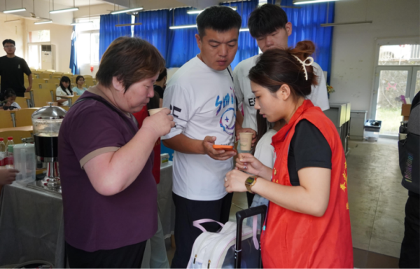 学校健康产业学院旅游专业的学长学姐们利用专业技能,调制了冰镇酸梅汤、果茶、冰萃咖啡等饮品,既为新生和家长送去“凉爽”,又向他们展示了专业技能。