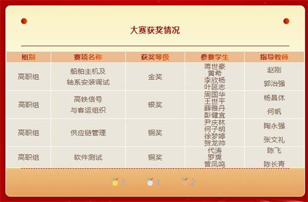 近日,在2024年世界职业院技能大赛总决赛争夺赛中,重庆交通职业学院4支参赛队凭借优异的技能水平、出色的团队协作以及不懈的拼搏高质量完成比赛,荣获1金1银2铜的佳绩,实现四个参赛项目100%获奖。