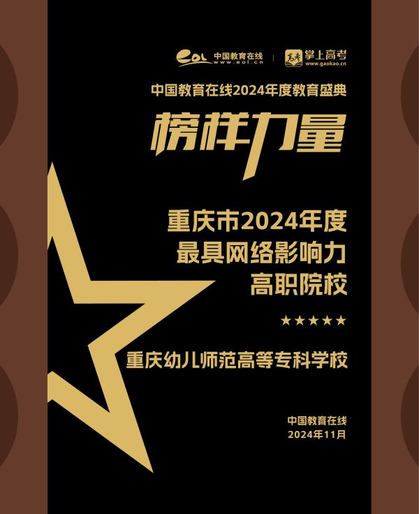 “2024年度最具网络影响力高职院校”通过综合评估各高职院校在招生宣传中运用网络媒体平台、数字化技术进行精准推广的效果,并结合大数据分析及多渠道宣传整合策略评定得出。 一直以来,重庆幼儿师范高等专科学校深谙网络传播势能,积极构建全方位、多层次的新媒体矩阵。从官方网站的智能升级,到社交媒体账号集群的精细化运维,无一不彰显着重庆幼儿师范高等专科学校接轨新时代的决心。
