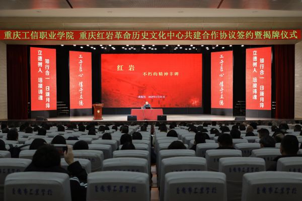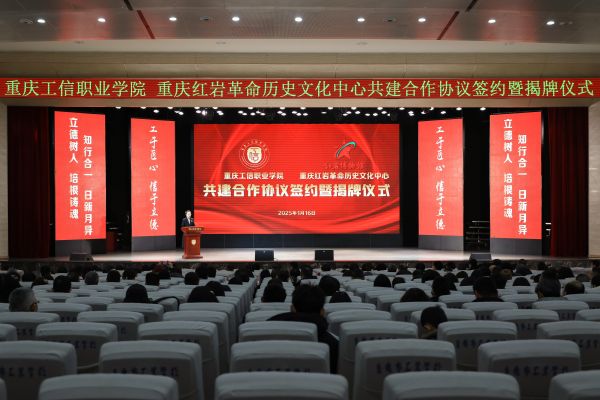 2025年1月16日上午,重庆工信职业学院与重庆红岩革命历史文化中心共建合作协议签约暨揭牌仪式在渝中校区隆重举行,红岩革命文化中心党委委员、副主任黄振伟、红岩文化中心宣教处副处长罗雪、红岩文化中心六级职员蒲勤以及重庆工信职业学院领导班子、全校教职工共同见证了这一历史时刻。仪式由团委负责人李卉卉主持。