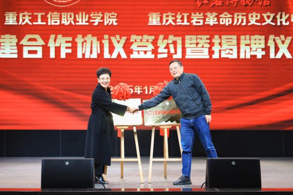 签约仪式上,重庆工信职业学院马克思主义学院负责人李琪和红岩文化中心宣教处副处长罗雪代表双方单位郑重签约。重庆工信职业学院党委副书记、院长杜宏伟和红岩文化中心党委委员、副主任黄振伟共同为“红岩文化进校园示范教育基地”“重庆工信职业学院思政教育研学实践基地”揭牌,仪式在全校教职工热烈的掌声中结束。