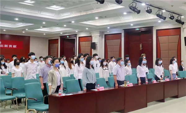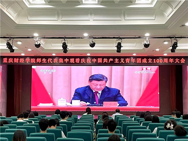 重庆财经学院校党委书记张毅、党委副书记房朝君、党委宣传部部长倪倩茜、学生工作部副部长张玉华、团委书记夏文瑞、各学院团总支书记及师生团员代表共计90余人,齐聚学术报告厅观看直播,共同见证了这一具有重大而深远意义的历史时刻。同时,重庆财经学院校团委还组织学生会、学生社团和各基层团组织的青年团员通过不同方式也观看了直播。