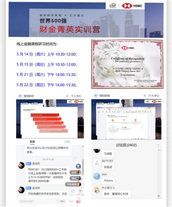 为了帮助重庆财经学院ACCA班的学生全方位深入了解金融市场、商业银行、投融资等领域的前沿知识,掌握商科专业职业发展与晋升路径,5月14日至5月22日,重庆财经学院会计学院组织ACCA班学生参加了由全球顶级金融名企汇丰银行携手楷柏财经教育举办的【世界500强财金菁英实训营】线上金融课程。本次课程由汇丰银行中国资深投资专家边文澎担任课程导师。