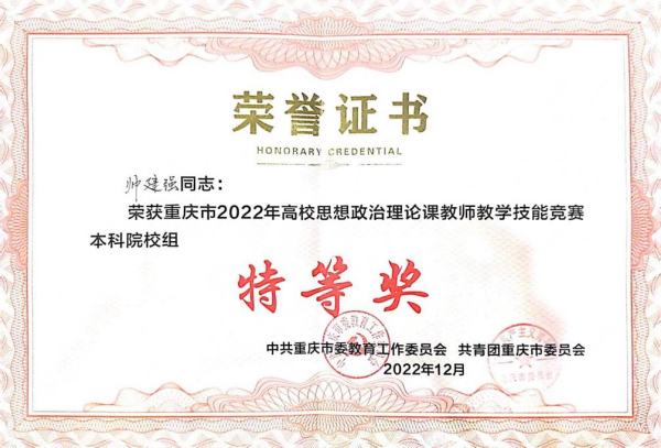 12月19日至20日,由重庆市委教育工委、市教委、团市委主办,重庆工程职业技术学院承办的2022年重庆市高校思政课教学技能竞赛顺利举行。重庆科技学院马克思主义学院教师帅建强凭借扎实的理论功底,突出的教学技能和丰富的教学经验,获得本科组第二名,并获得特等奖,实现重庆科技学院在高级别教学技能比赛上的突破。