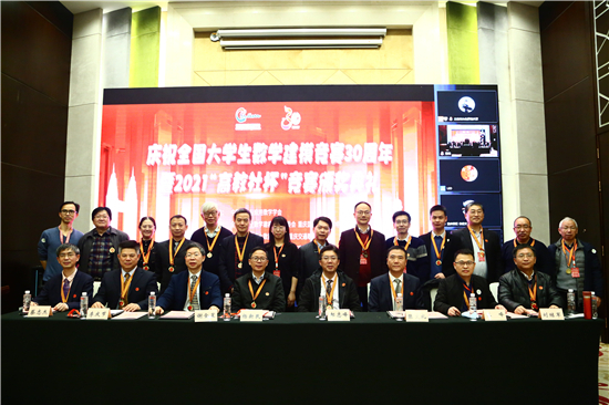 庆祝全国大学生数学建模竞赛30周年暨2021“高教社杯”竞赛颁奖典礼于2021年12月25日以线上会议的方式举行,线上主会场和第一分会场设立在重庆市渝州宾馆。参加本次会议的嘉宾有:北京大学党委常委、副校长、中国工业与应用数学学会理事长、全国大学生数学建模竞赛组委会顾问张平文院士,重庆市教委刘林芽副主任,中国数学会秘书长巩馥洲研究员,重庆交通职业学院张文礼副校长,同方知网教育本部副总经理王峰先生,MathWorks中国区教育行业总经理李庆节先生等。全国政协常委、中国科协副主席袁亚湘院士发表了视频讲话,全国大学生数学建模竞赛组委会主任陈叔平教授作了书面发言,高等教育出版社副总编辑林金安编审发表了视频讲话。本次典礼由中国工业与应用数学学会副理事长杨新民教授主持。