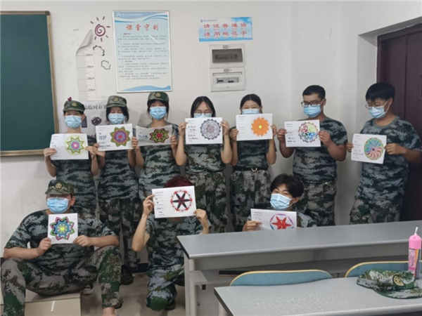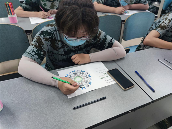 作品完成后,组织同学们欣赏自己画成的图案,分享彼此绘画过程中的体验、联想和感悟,完成情绪的表达和心态的转换。