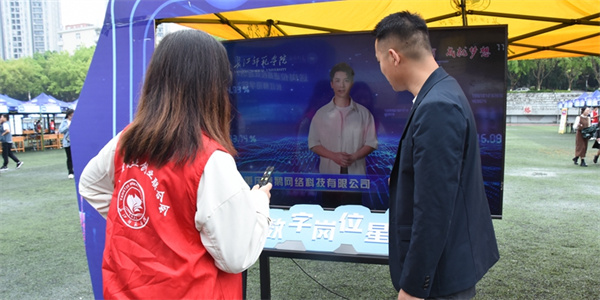 线下设置的“AI数字人求职体验区”让求职变得更加智能化,同学们可以在AI智慧屏上参与互动,找到适合自己的岗位,更加方便快捷地了解岗位信息。