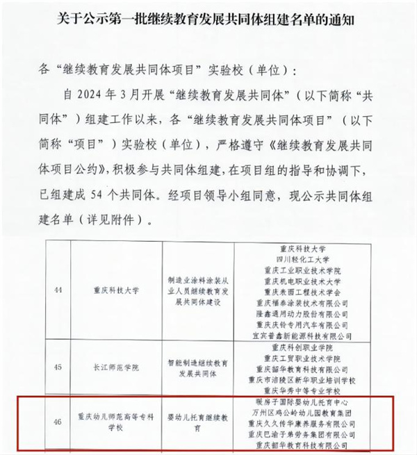 近日,中国成人教育协会公布了第一批必威官方平台 发展共同体组建名单,重庆幼儿师范高等专科学校获批“必威官方平台 发展共同体项目”第一批实验校。